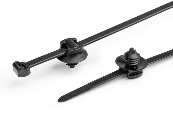 These two-piece fixings are supplied ready assembled and offer a simple and versatile method of bundling and fixing cables. The fir-tree base will easily push into pre-punched holes in panels or threaded, blind, holes and offers a very secure fixing. The two-piece design enables the head of the tie to be orientated to the required position to ease assembly, whilst the 'disc' on the top of the fir tree covers the hole and minimises the ingress of water and dirt. |